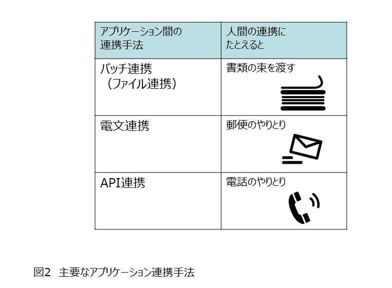 APIの特徴を理解するには、API以外のアプリケーション連携手法と比べてみるのがよいでしょう。そこで、この記事では、「バッチ連携」と「電文連携」とAPI連携を対比してみることにします。