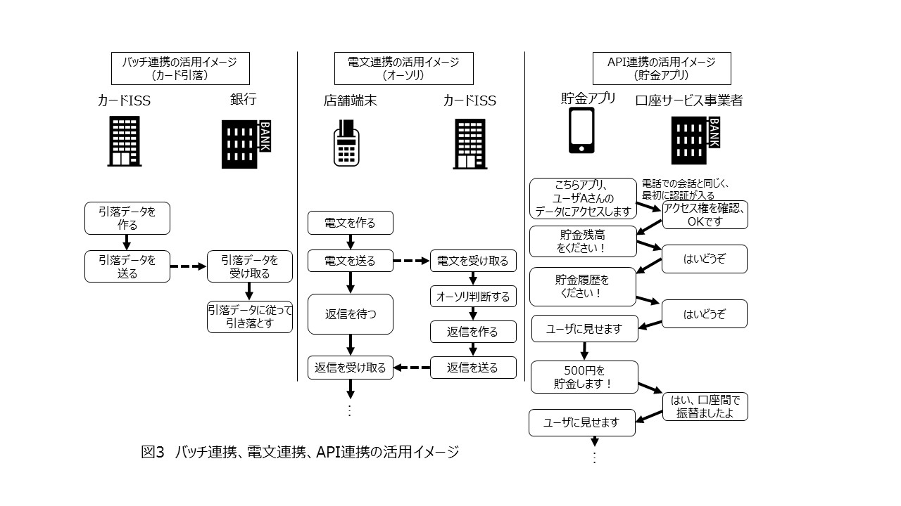 バッチ連携、電文連携、API連携という、これら3種類のアプリケーション連携手法の決済とFinTechでの活用イメージを図3に示します。