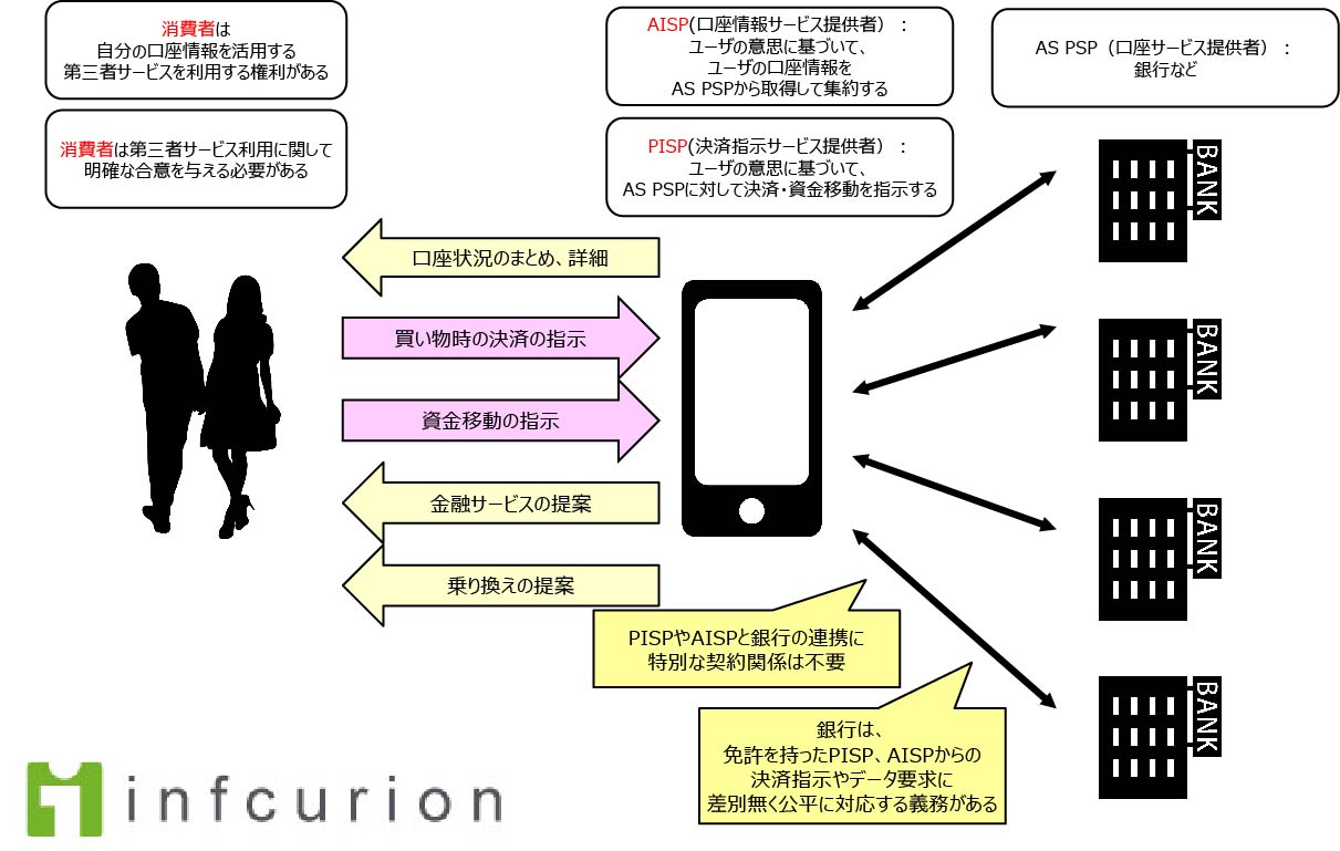 図の左には消費者がいます。PSD2の基本思想は、「消費者には、自分の口座情報を活用する第三者サービス(AISP、PISP)を利用する権利がある」というもの。消費者自身がAISP、PISPに、自身の口座へのアクセスを、明確な合意を与えるのならば、銀行はそれを拒むことはできないとするのがPSD2です。