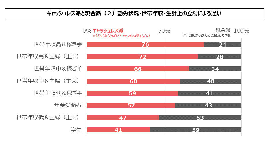 そしてキャッシュレス派の割合にはきれいなパターンが表れています。まず、世帯年収が高いほどキャッシュレス派の占める割合が大きくなっています。そして、同じ世帯年収レンジであれば、稼ぎ手のほうがキャッシュレス派が多くなっています。