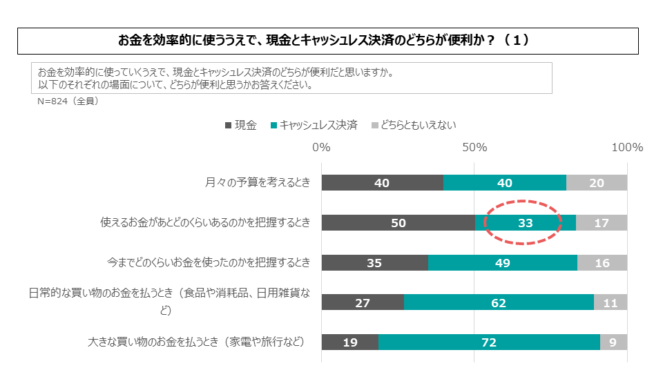 しかし予算管理系のユースケースでは、現金のほうが便利との回答が増えてきます。「月々の予算を考えるとき」では現金・キャッシュレス決済とも40%で拮抗していますが、「使えるお金がどのくらいあるのかを把握するとき」では現金が50%に対してキャッシュレス決済は33%となっています。