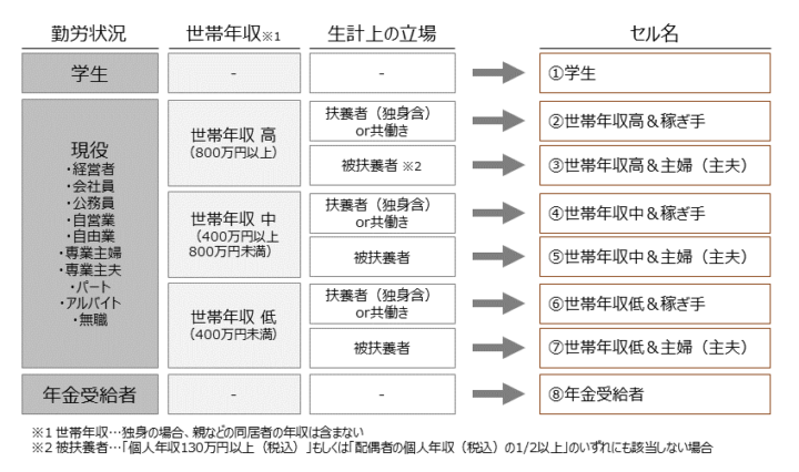 まず日本の消費者を勤労状況によって「学生」「現役」「年金受給者」に三分類します。そして「現役」を世帯年収によって三分類します。最後に、生計上の立場によって「稼ぎ手」と「主婦(主夫)」に分類します。こうにして八つのセルを定義し、それぞれ103人ずつをサンプルとして実施しているのが「決済動向調査」の詳細調査です。