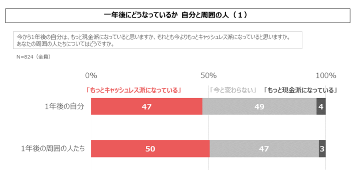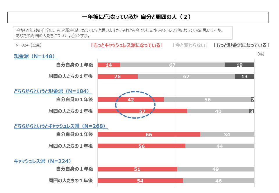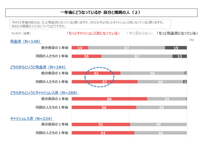 まず、現金派の19%が、「自分は1年後はもっと現金派になっている」と回答しました。さすが現金派、ともいえますが、同じ現金派のうち14%は「もっとキャッシュレス派になっている」と回答しています。現金派であっても、自分が少しずつキャッシュレス派になっていくと考える人が一定規模で存在しています。