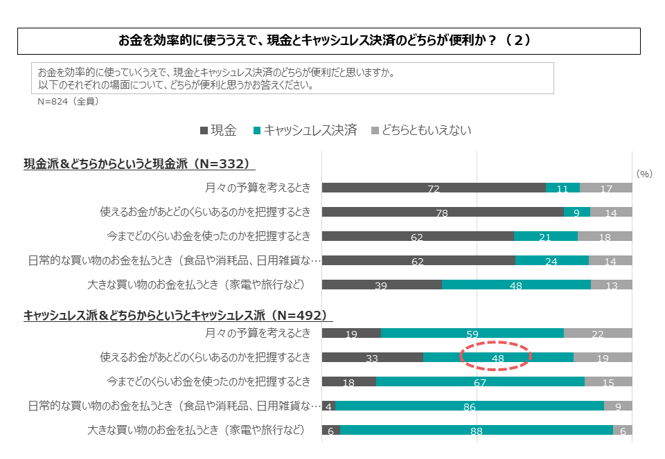 キャッシュレス派は、決済利便性については圧倒的にキャッシュレス決済を支持していますが、予算管理系ユースケースではキャッシュレス決済支持が揺らいでいます。そして「使えるお金の把握」ではキャッシュレス決済を選ぶ人は48%しかいません。キャッシュレス派から見ても、このユースケースはキャッシュレス決済の弱点ということがわかります。