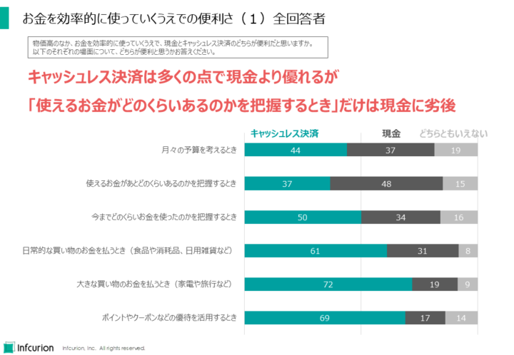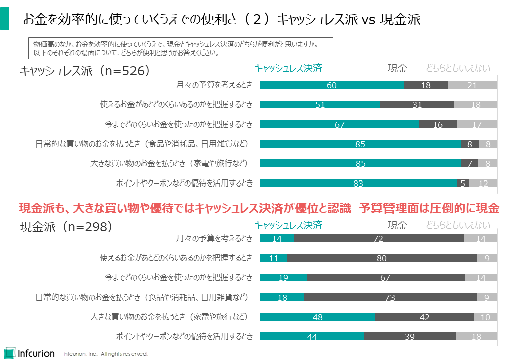 しかし現金派は、それ以外の場面では現金のほうが便利と答える人が圧倒的多数です。現金派をキャッシュレス派に転換していくには、決済利便性やポイントのお得感だけでなく、「お金を効率的に使ううえでのサポートの充実」が求められているといえるでしょう。