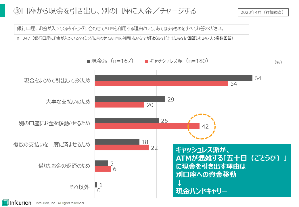 意外だったのは「別の口座にお金を移動させるため」という選択肢。キャッシュレス派の42%がこれを選択しました。現金派ではこれを選択した人は26%でしたので、現金派との差異も鮮明です。
