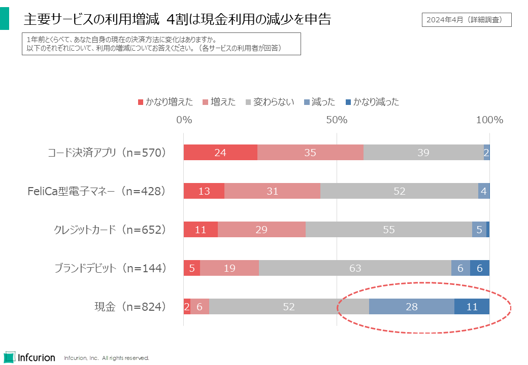 まず日本の消費者824人に、1年前と比べた決済方法の変化について聞いた結果が図1です。コード決済アプリでは約6割が利用増を申告しており、コード決済の拡大がここでも確認できますが、興味深いのは現金利用。約4割は利用が減少したと回答しています。前回記事(「増え続ける『キャッシュレス派』の消費者」)では「キャッシュレス派」を自認する消費者が増大し65%に達したことを紹介しましたが、こちらでも現金利用の減少とキャッシュレス決済利用の増加が観測できています。