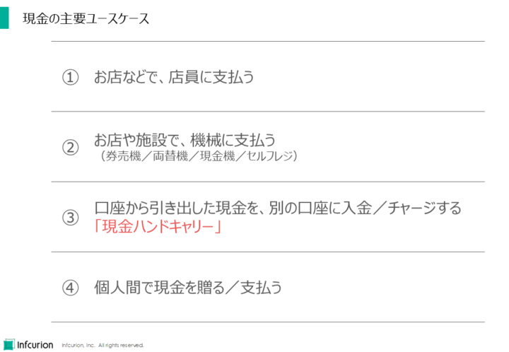 新紙幣は現金です。新紙幣発行が現金利用にどのようなインパクトを与えるのかを考えるために、まずは現金がどのように利用されているのかを見ていきます。図4に、現金の主な使われ方を4つ挙げます。