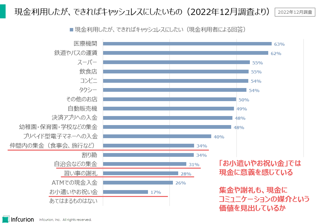 興味深いことに、個人間での現金のやりとりについては、現金のままにしておきたいという心理もあるようです。図7に、「現金利用したが、できればキャッシュレスにしたいもの」についての2022年12月の調査結果を示します。
