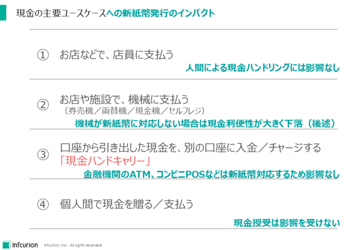 人間同士でのやりとりでは、新紙幣だろうが旧紙幣だろうがインパクトはありません。金融機関のATMやコンビニPOSでも影響はないでしょう。