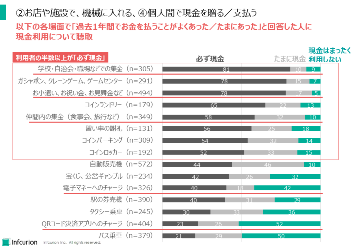 個人間のやりとりでは以下の場面で半数以上が「必ず現金」でした: