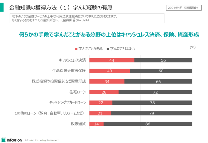 「学んだことがある」という人が最も多かったのは「キャッシュレス決済」で、全体の44%の人がそのように回答しました。「生命保険や損害保険」が2位で40%、「株式投資や投資信託など資産形成」が3位で34%という結果でした。