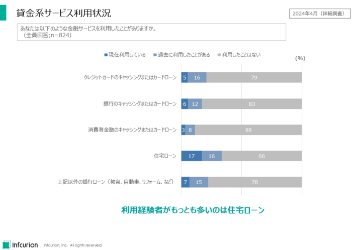 まずはリテール金融サービスの利用状況です。以下のような貸金系サービスを対象に現在または過去の利用の有無を聴取しました: