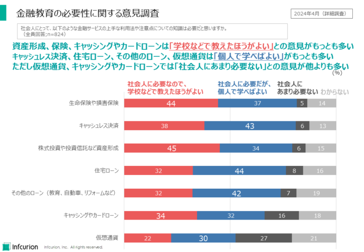 もっとも多い回答が「社会人に必要だが、個人で学べばよい」だったのはキャッシュレス決済、住宅ローン、その他のローンでした。これらのサービスは広く普及しているとはいえ、万人が利用しているとも言えないところが共通点として考えられます。こうしたサービスについては必要に応じて個人で学べばよいという態度が浮き彫りになりました。