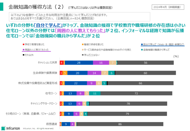 特筆すべきは、住宅ローン以外で2位となった回答は「周囲の人に教えてもらった」であることで、インフォーマルな経路で金融知識が伝播していることがわかります。
