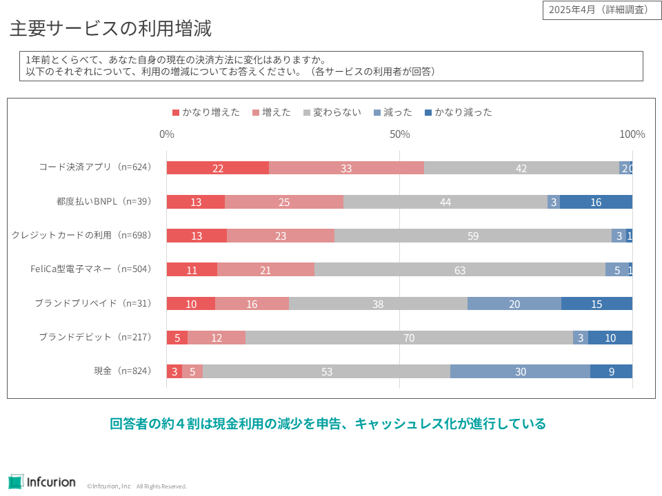 一方で、注目すべきは現金利用の減少です。「減った」(30%)と「かなり減った」(9%)を合わせると約4割の回答者が現金の利用が減少したと答えており、日本におけるキャッシュレス化が着実に進行していることが浮き彫りになりました。クレジットカードも「かなり増えた」(13%)と「増えた」(23%)を合わせると36%と堅調な伸びを見せています。