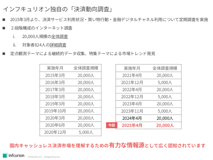 われわれインフキュリオンが2015年から定期的に実施している「決済動向調査」は、国内キャッシュレス決済市場を理解するための有力な情報源のひとつとして知られています。2025年4月には、全国の16才~69才の男女20,000人を対象に、最新の「決済動向2025年調査」を実施しました。