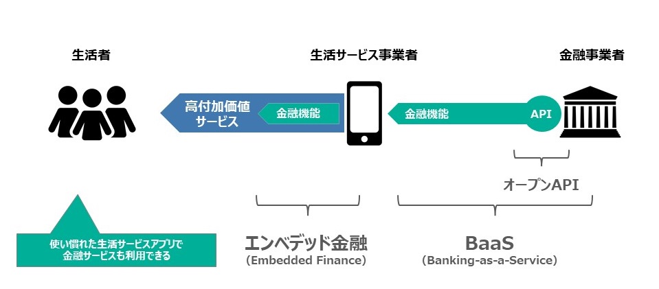 BaaSとは金融事業者によるサービス提供の新たな形態であって、APIを活用して金融機能を異業種である生活サービス事業者に提供するもの。生活サービス事業者はAPIで提供された金融機能を自社サービスに組み込む(エンベッドする)ことで、より付加価値の高いサービスをエンドユーザーたる生活者に提供することができる。このように、異業種サービスに金融機能が組み込まれた(エンベデッドされた)状態が「エンベデッド金融」なのである。