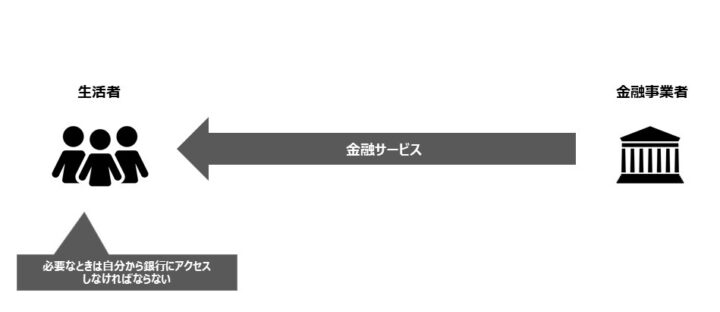 従来の金融サービスでは、生活者たるユーザーは必要な時に自分から店舗やATMを訪れたりアプリにログインしたりというように、金融事業者が用意したチャネルにアクセスしなければならない。金融事業者のチャネルにおいて直接やりとりしなければならないという点で、「直販モデル」と筆者は呼んでいる。金融事業者の管理下でサービスを受けられるという点は安心だが、生活者の日常行動から自然にアクセスするような導線にはなりえない。日常的・継続的な接点となる要素にも極めて乏しい。たとえアプリ等のチャネルの使い勝手がどれほど素晴らしくても、銀行アプリに毎日アクセスする人はほとんどいない。