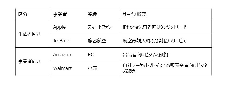 生活者向けサービスの文脈で語られることの多い「BaaS+エンベデッド金融」だが、エンドユーザーを個人に限定する必要はなく、SME(中小事業者)など事業者を対象とすることに何ら問題はない。実際、表1のとおり、AmazonとWalmartはGoldman SachsのBaaSを活用して事業者向けの金融サービスを展開している。