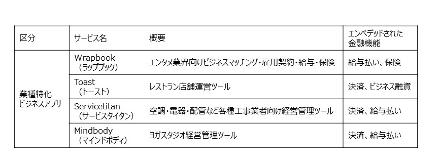 表2 ビジネスアプリにおけるエンベデッド金融事例(米国、BaaSとは限らない)