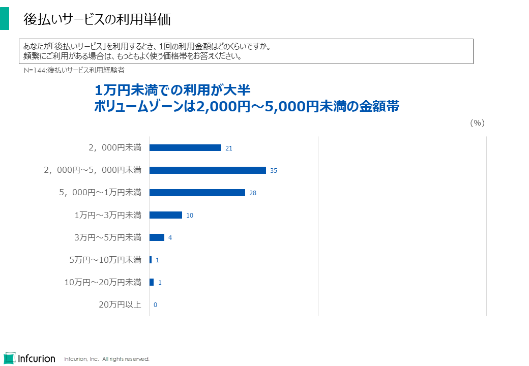 後払いサービスの利用単価は「1万円未満」が大半で、最もよく利用される価格帯は「2,000円~5,000円未満」であることがわかりました。
