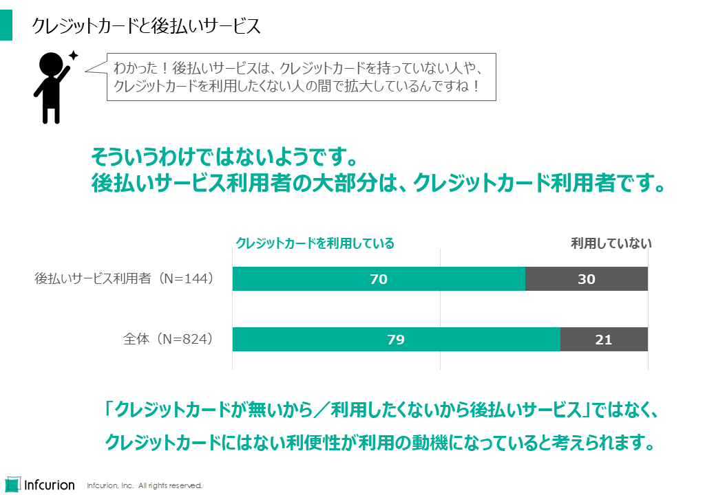 後払いサービス利用経験者のうち、クレジットカード利用者は70%。後払いサービス利用者はクレジットカードも併用していることが示されました。