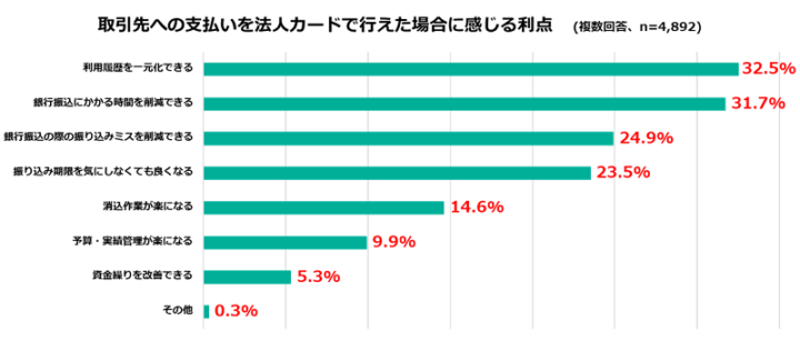 (株式会社インフキュリオン「法人カード利用実態調査」より。質問:取引先への支払い作業を法人クレジットカードで行える場合、メリットに感じることをお選びください。法人の経理・会計・財務業務担当者4,892名の回答)