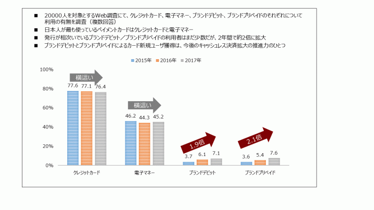 2年間で利用率にあまり変化のないクレジットカードと電子マネーに対して、ブランドデビットとブランドプリペイドは明らかに拡大傾向にあります。それぞれ「利用している」と回答した人は7.1%と7.6%と絶対数は大きくありませんが、2015年からの2年間で約2倍に拡大しています。