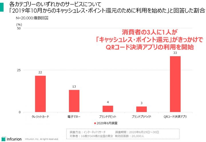 - 「キャッシュレス・ポイント還元」のために新たなQRコード決済アプリの利用を始めた人が全体の33%。新たなクレジットカードの利用を始めた人は22%