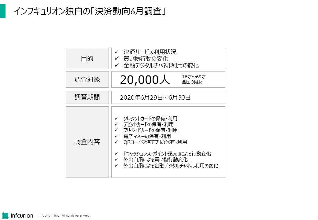 インフキュリオンでは2015年以降、毎年3月に「決済動向調査」を実施しており、その結果はこの「インフキュリオン・インサイト」や雑誌メディア等でたびたび紹介しています。今回紹介する「決済動向6月調査」は、「決済動向調査」と同様に、全国の16~69才の男女を対象とするインターネット調査です。主要な決済サービスの利用状況を調査したほか、「キャッシュレス・ポイント還元」による行動変化、新型コロナ禍における外出自粛による買い物行動変化、そして外出自粛による金融デジタルチャネル利用の変化に関して調査している点が大きな特徴です。