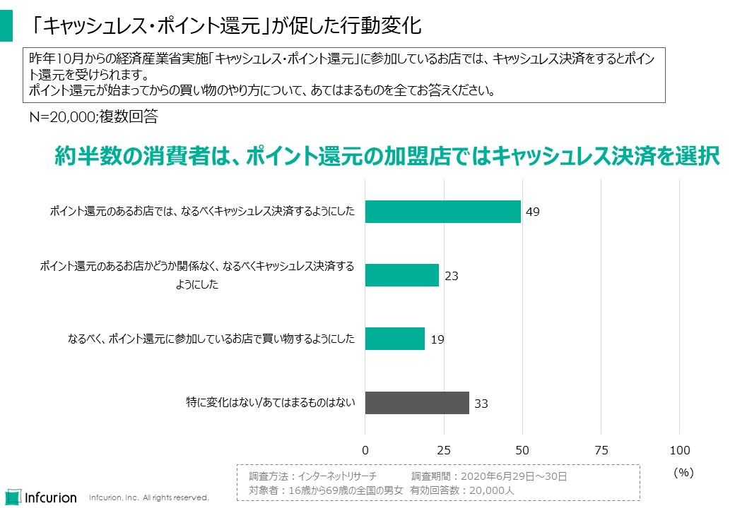 また、19%の人は「なるべくポイント還元に参加しているお店で買い物するようにした」と回答しており、ポイント還元施策の送客効果も確認できました。