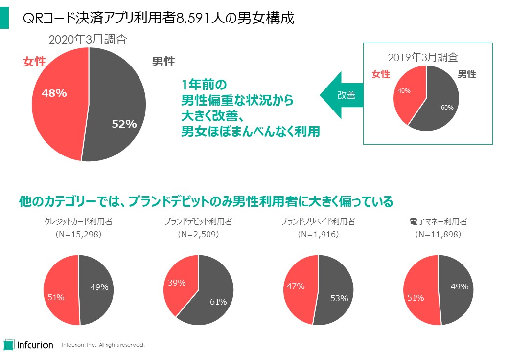 - QRコード決済アプリ利用者の男女比は52:48、2019年3月の60:40という男性偏重の状況から大きく改善