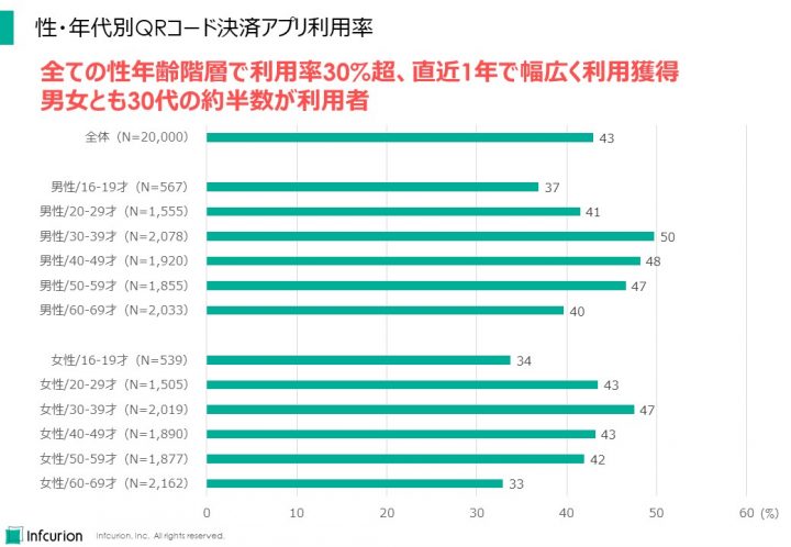 - 全ての性年齢階層でQRコード決済アプリの利用率が30%超、幅広く利用獲得している状況