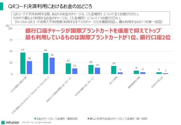 考えてみれば、QRコード決済アプリの利用率首位であるPayPayが、60社以上(執筆時点)の金融機関からの銀行口座チャージ機能を提供しているので、この結果はそう驚くべきものではないのかもしれません。