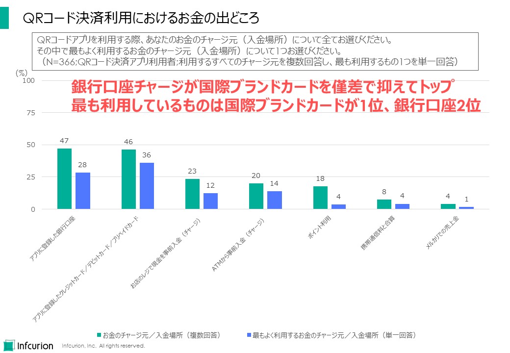 - QRコード決済利用におけるお金の出どころでは銀行口座チャージが国際ブランドカードを僅差で抑えてトップ