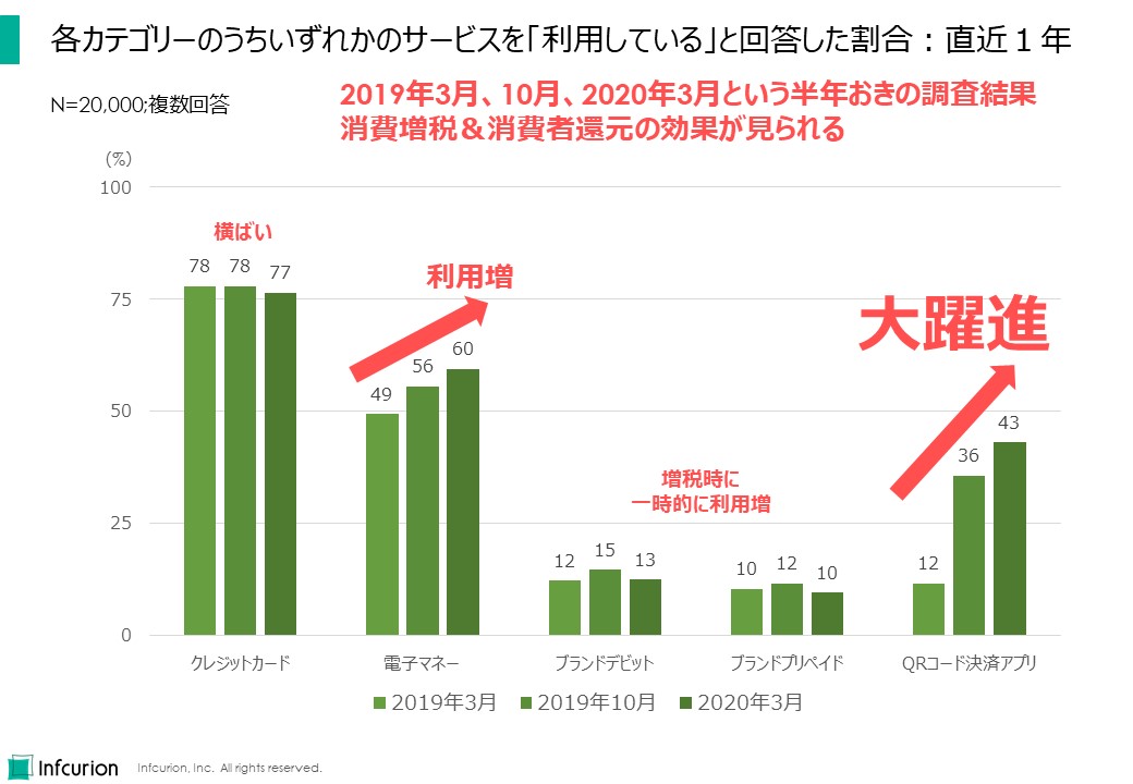 注目なのは、QRコード決済アプリの大躍進。1年間で12%から43%へと利用率が驚異的な拡大を記録しました。