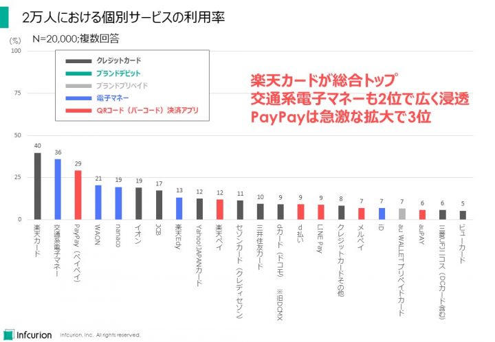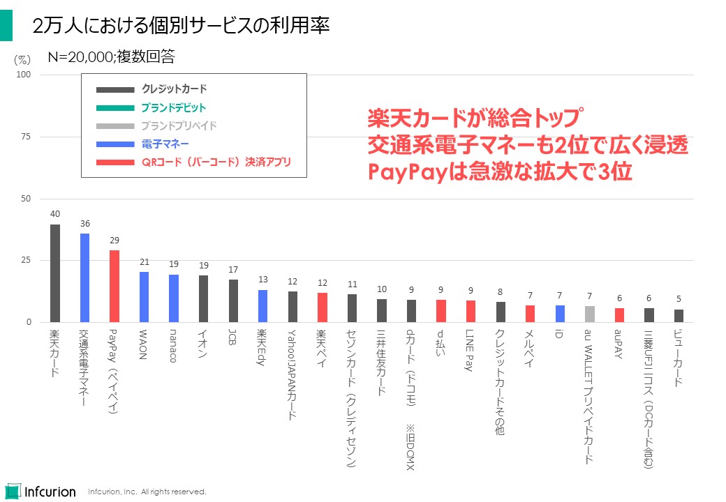 個別サービスの利用率では楽天カード(40%)が首位、2位は交通系電子マネー(36%)、3位はPayPay(29%)、4位はWAON(21%)、5位はnanaco(19%)という結果となっています。
