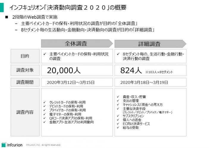 2015年から毎年3月に実施している「インフキュリオン決済動向調査」は、「全体調査」と「詳細調査」の2段階で構成されるインターネット調査です。調査地域は全国、対象者条件は16才から69才の男女。