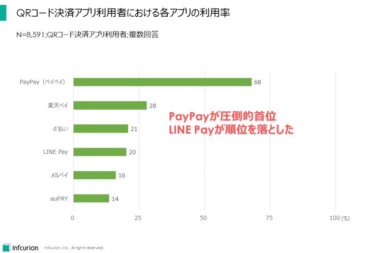 - QRコード決済アプリではPayPayが圧倒的首位、LINE Payは順位を落とした