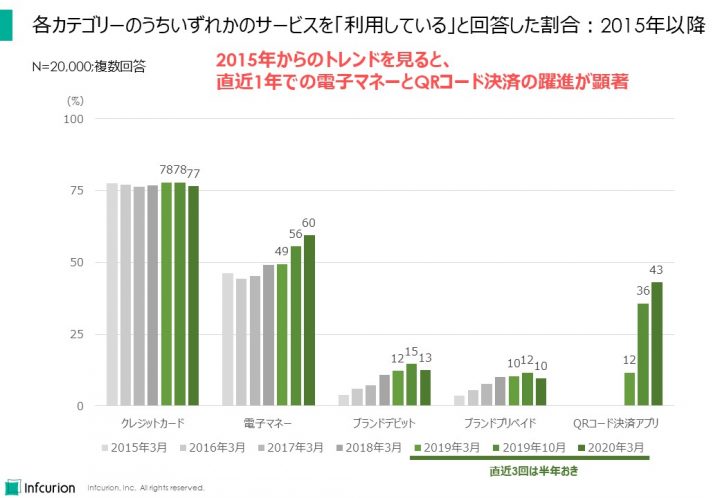 各カテゴリーのうちいずれかのサービスを「利用している」と回答した割合:2015年以降クレジットカードは横ばい。電子マネーは最近の1年間で拡大。ブランドデビットとブランドプリペイドは拡大の踊り場に。そしてQRコード決済アプリは大躍進、という大きな動きがわかると思います。