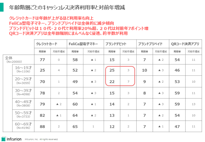 ブランドデビットは約15%の水準で最近は推移しています。劇的な拡大は見えませんが、実は若年層にじわじわ浸透していっていることが今回調査でわかっています。この点は後述します。