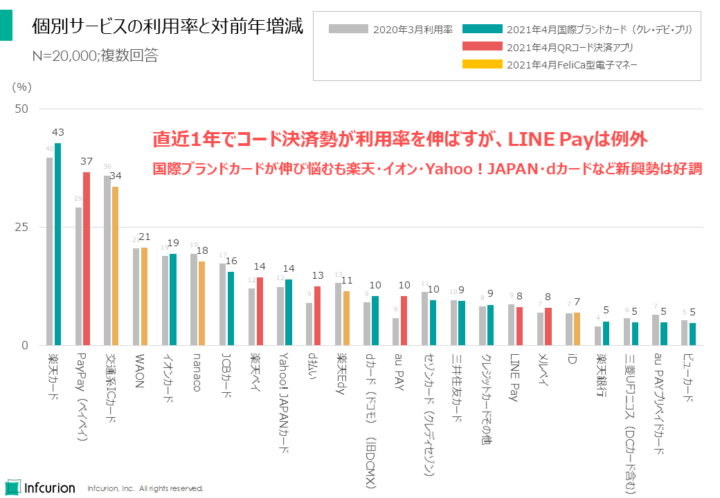 全体的には、直近1年間でのコード決済勢の利用率の伸びが印象的です。ただし大手コード決済勢のうち「LINE Pay」のみ例外となっており、対前年で利用率減少となっています。