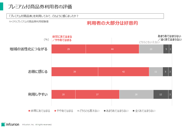 プレミアム付商品券の利用者の大多数が、「地域の活性化につながる」「お得に感じる」など好意的に評価していることがわかりました。