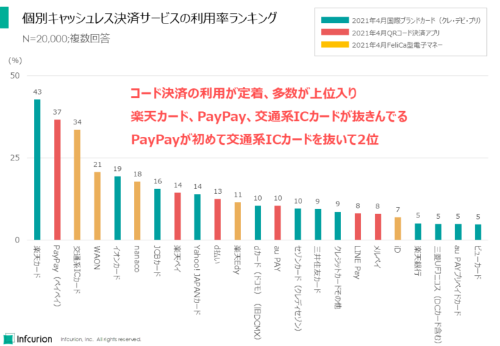 「PayPay」が37%で、初めて「交通系ICカード」を抜いて2位となりました。