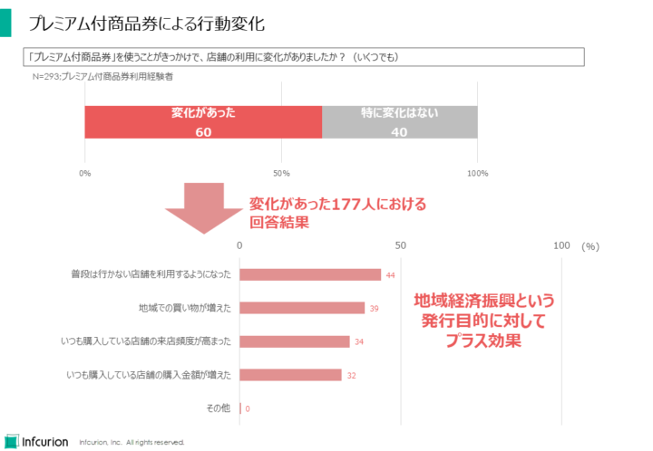 プレミアム付商品券の利用経験者に行動変化の有無を尋ねたところ、60%は「変化があった」と回答。主な変化として「普段はいかない店舗を利用するようになった」(44%)、「地域での買い物が増えた」(39%)が上位となり、地域経済振興という発行目的に対してプラスの効果が得られていることがわかりました。