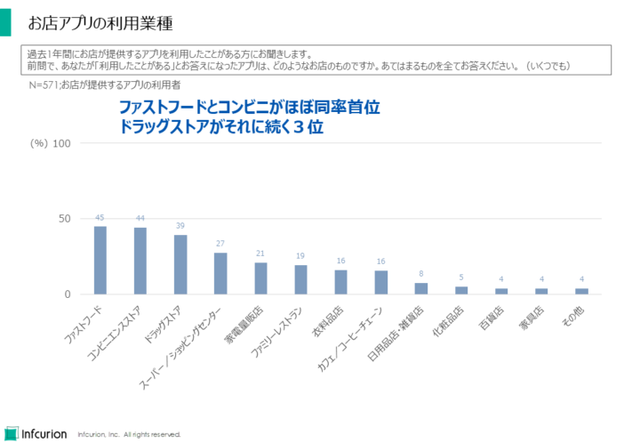 「ファストフード」(45%)がトップ、次いで「コンビニエンスストア」(44%)、「ドラッグストア」(39%)が続きます。