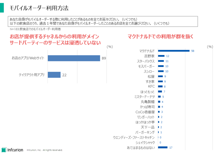 今回調査では、モバイルオーダーはお店が提供するチャネル(アプリ/Webサイト)からの利用がメインであって、サードパーティが提供するサービスの利用は浸透していないことがわかりました。