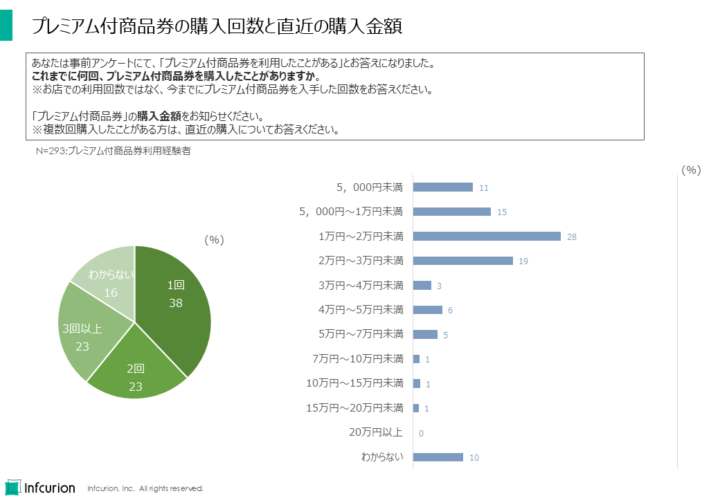プレミアム付商品券の購入回数は「1回」(38%)が最多、購入金額は「1万円~2万円未満」(28%)が最多となりました。