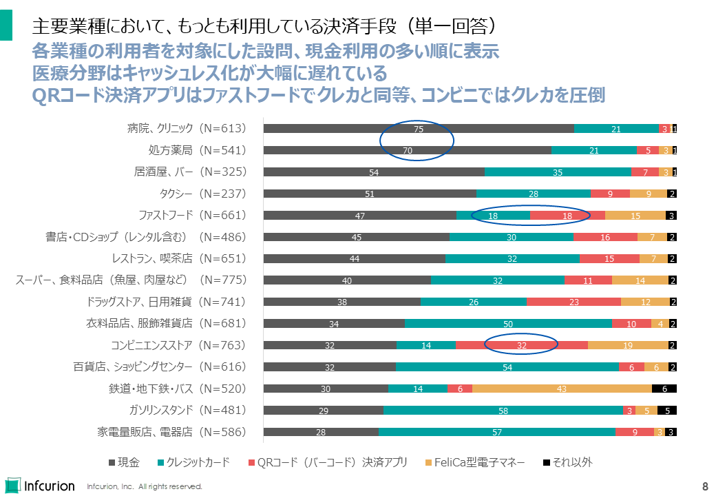 「病院、クリニック」は現金払いする消費者が70%を超えており、キャッシュレス化が大幅に遅れていることがわかります。
